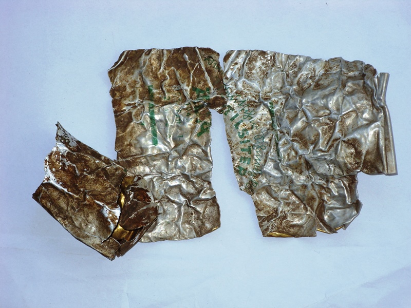 Foto n. 2) Iniziamo l’esposizione dei cimeli con un involucro che può apparire insignificante, ma che, invece, aveva un contenuto essenziale per il combattente tedesco che se ne disfece: il formaggio “Tilsit”. Sui resti del contenitore si può ancora leggere l’anno di produzione 1942. Il reperto proviene da Poggio Cavadenti