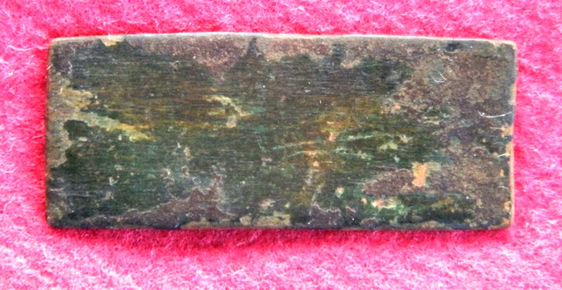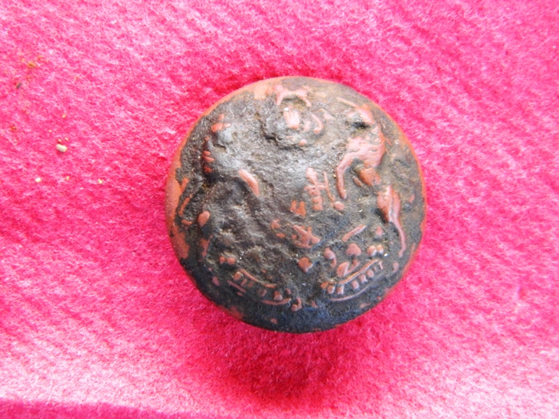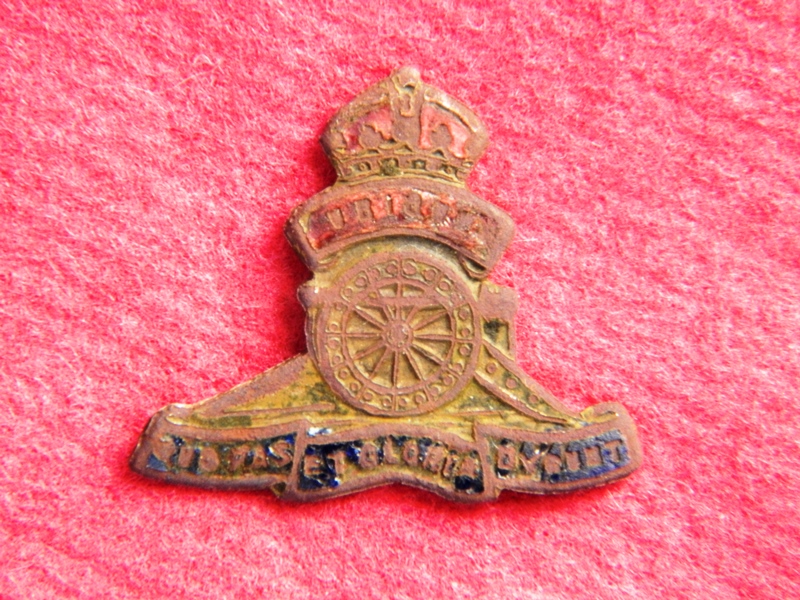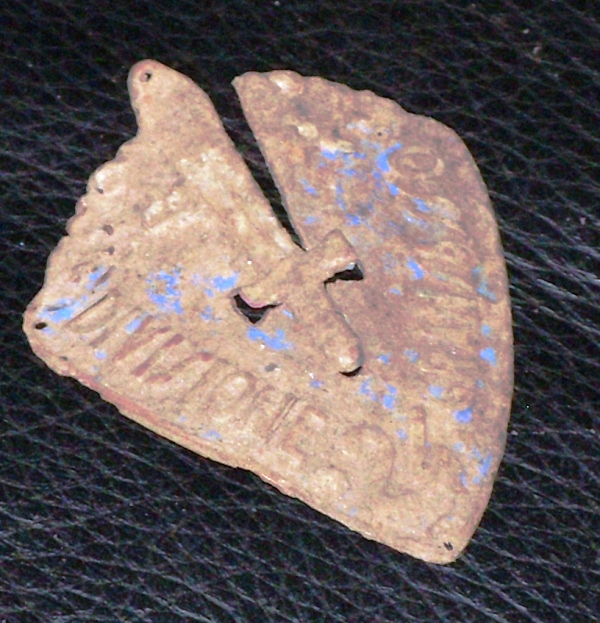 Foto n. 3, 4) Eccezionale ritrovamento in località Stoppiacce, sul versante di Monte Lignano che domina la Val di Chiana. È uno scudetto della 24ª Divisione di Fanteria “Gran Sasso”, evidentemente portato da qualche reduce delle guerre coloniali, poiché la 24ª Divisione, nel 1939, cambiò il nome in “Pinerolo”. Alle Stoppiacce, oltre ai soliti bossoli inglesi e tedeschi e a resti d’ordigni, è stato reperito anche un distintivo della Polizia Militare Inglese, una mezza placchetta identificativa tedesca, una monetina con la svastica (c’erano le Grenadier Guards), un gemello da polsino, il tappo inferiore di una bomba a mano inglese “Mills”