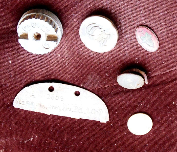6i, 6l, 6m, 6n) Un gruppetto d’altri interessanti oggetti. Insieme a vari tipi di bottoni si vedono il distintivo di una decorazione, i fregi da berretto di un appartenente al Reggimento “Essex” e da colletto di un artigliere, nonché il piastrino di riconoscimento di un soldato americano, un’eccezione nel teatro d’operazione aretino
