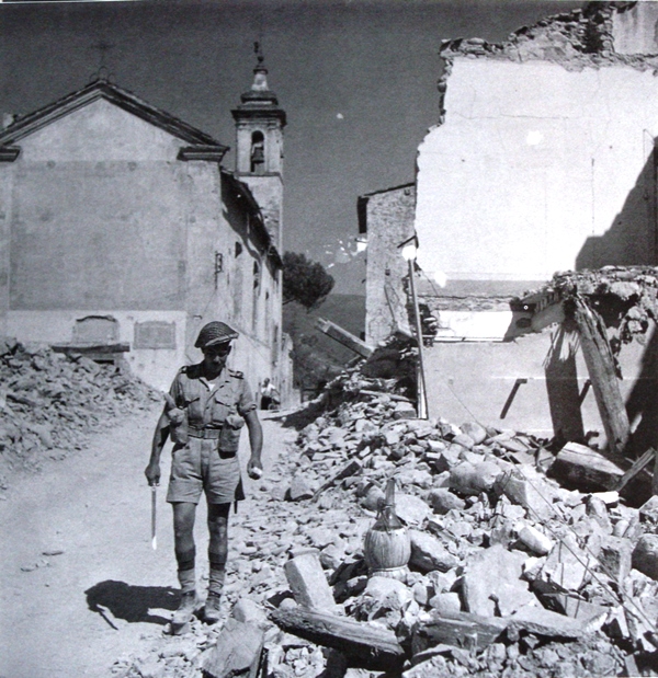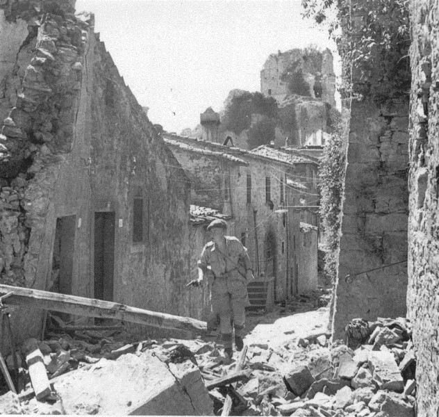 Foto n. 6) Un soldato inglese, rivoltella in pugno, avanza nella via centrale di Civitella in Val di Chiana semidistrutta. Oltre a compiere la strage di Civitella, i tedeschi uccisero pure contadini e abitanti dei paesi nella vicina Val di Cornia, zona di passaggio per recarsi in Valdambra
