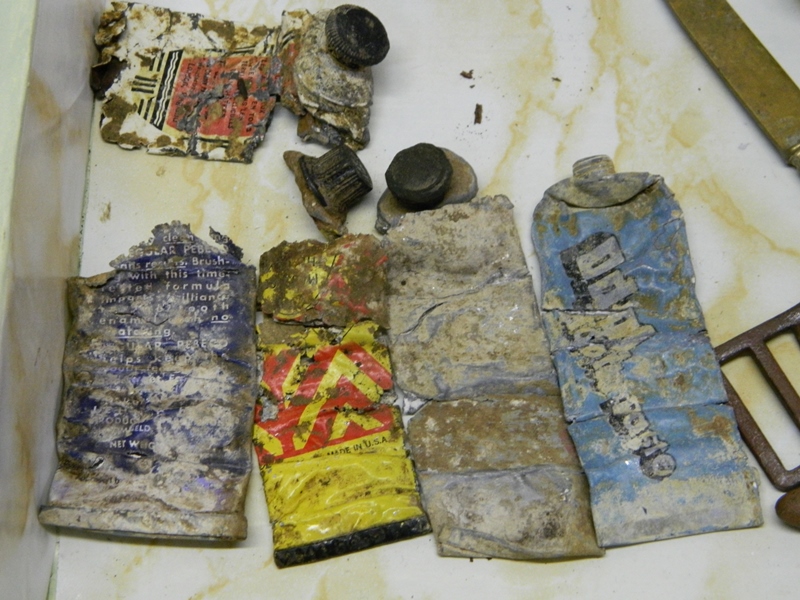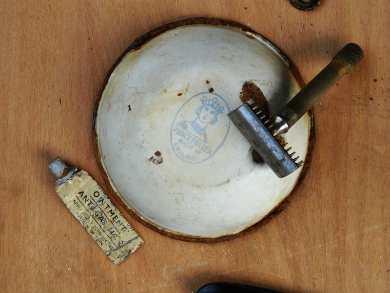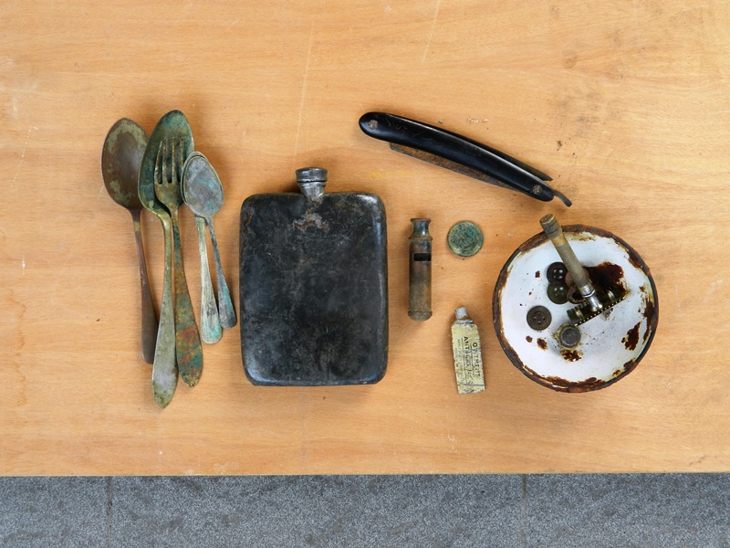 6f, 6g) Una tazzina e un rasoio di sicurezza per radersi, vicino a questi oggetti si vede un tubetto schiacciato, conteneva la pomata da applicare sulla pelle per difendersi dagli attacchi a gas. Intorno all’accampamento sono stati trovati molti altri tubetti vuoti, ne mostriamo alcuni che contenevano dentifrici o farmaci