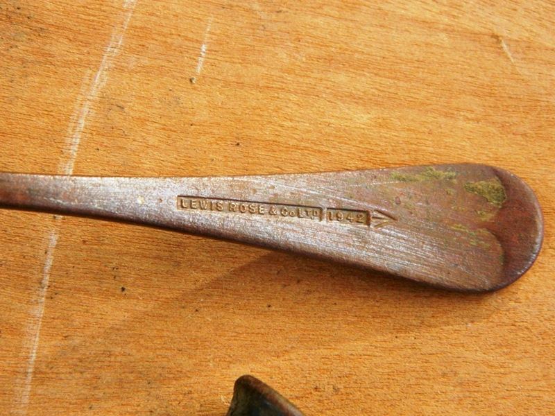 6c) La parte posteriore del manico di un cucchiaio vista in primo piano; si notano la sigla dell’azienda produttrice e la data 1942