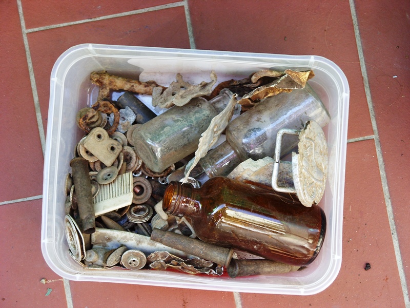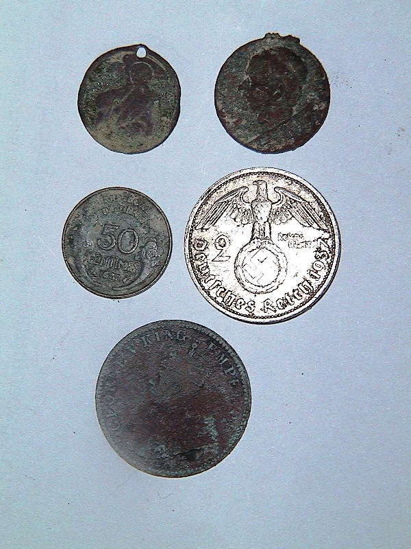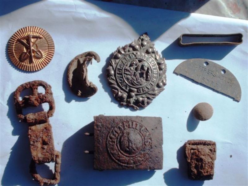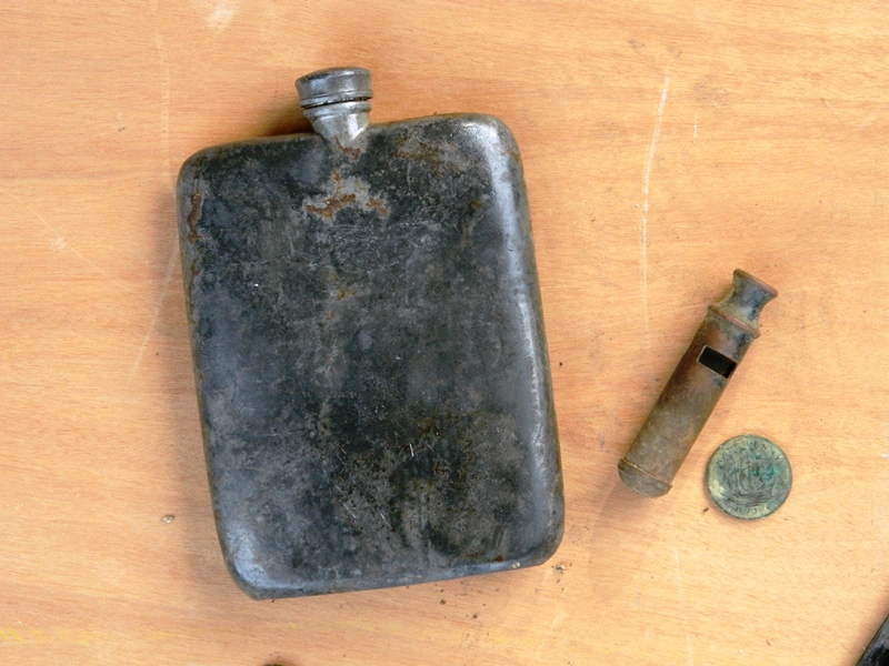 6h) Altro materiale, certamente appartenuto ad un ufficiale britannico: una piccola borraccia per liquore, un fischietto di robusto ottone, perfettamente funzionante, una monetina da mezzo penny con l’effige di Giorgio V. Poco distante ce n’era un’altra con il ritratto d’Edoardo VII