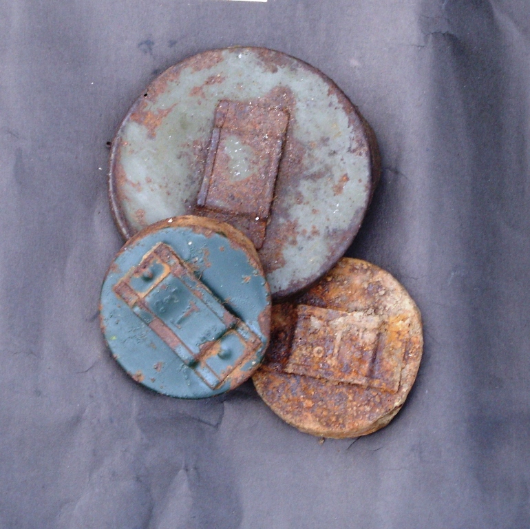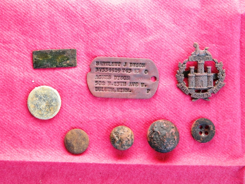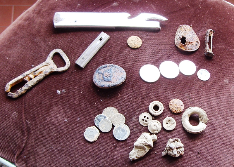 Foto n. 6a, 6b) Un gruppetto di cimeli rintracciati in un accampamento che i britannici allestirono in un boschetto vicino Spoiano, nei pressi di Tegoleto, equidistante dai rilievi di Lignano, Civitella e Malfiano, monti ancora in mano alle truppe di Kesselring. Il bosco, dal quale presumibilmente erano stati cacciati i tedeschi (sono state rinvenuti il fondo di un piatto con effigiata la svastica, alcuni bossoli e qualche scheggia), consentiva di nascondere truppe e mezzi fra gli alberi, riparandosi, nello stesso tempo, dal cocente sole estivo. La sosta dei britannici deve essere durata qualche giorno e interrotta bruscamente da un evento sconosciuto, altrimenti non si spiega il ritrovamento di numerosi rasoi di sicurezza, molti bottoni di camicia e giacca (fra i quali quello con i leoni e lo scudo dei Tudor), posate e altro materiale d’uso personale