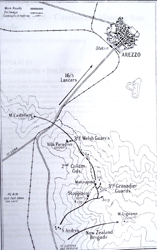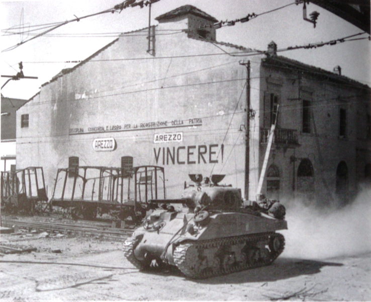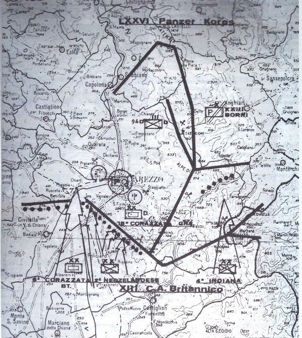 Il XIII Corpo Britannico lottò duramente per raggiungere Arezzo. Contro le forze germaniche combatterono la II Divisione Neozelandese, la VI Divisione Corazzata britannica, la I Brigata Guardie, il 16/5 Lancers Regiment, la IV e VIII Divisione Indiana e altri Reparti minori. Queste forze avevano a disposizione centinaia di carri armati e cannoni. Il 9 luglio la Divisione Neozelandese ricevette l’ordine di staccarsi dal I° Corpo Canadese e avanzare per attaccare fra le montagne; nel frattempo i tedeschi effettuarono diversi contrattacchi, nel tentativo di riguadagnare l’iniziativa. Il 13 luglio il 9° Gurka della 4ª Divisione Indiana occupò il Monte Favalto, sul crinale che porta verso Lignano – la cima più alta, eretta a principale baluardo dai tedeschi – e avanzò attraverso i monti per minacciare l’“Arezzo Linie” e raggiungere la città da est, con cruenti scontri sia lungo la cresta dello stesso Monte Lignano, sia sull’Alpe di Catenaia. Sul Monte Lignano, nella notte fra il 14 e il 15 luglio, mentre la 6ª Divisione Corazzata agiva dalla valle, i neozelandesi della 6ª Brigata di Fanteria, coadiuvati dai paracadutisti italiani dello “Squadrone F” (che, nella vicina località Corniolo, ebbe due morti), attaccarono il rilievo da sud, avanzando sui cocuzzoli denominati Castiglion Maggio (vi combatterono gli Argyll and Sutherland Highlanders e alcuni elementi del nostro Esercito), Poggio Cavadenti, Monte Altoviti e Monte Camurcina. Queste alture, che s’affacciano sulla Val di Chiana e consentono di vedere ogni movimento sulle vie di transito verso Arezzo, erano difese da soldati germanici appartenenti alla 305ª Divisione di Fanteria del 76° Panzer Korps e al 115° Reggimento della Divisione Panzer Grenadieren, che avevano sbarrato l’area antistante le postazioni di mitragliatrici, nascoste nelle cosiddette “Tane di volpe”, e con mine collegate a fili a strappo. Sul crinale, dal 10 al 14 luglio, furono rovesciati torrenti di fuoco; fonti inglesi parlano di 800 colpi al minuto e i tiri erano eseguiti sulla base dei dati forniti dai ricognitori Alleati. Dopo il bombardamento con i cannoni si mossero i caccia bombardieri, gettando bombe, spezzoni incendiari e mitragliando le postazioni dei tedeschi che, in un loro rapporto, asserivano: “Abbiamo perso Monte Lignano. Da qui il nemico ha un’ottima visione di Arezzo, quindi non possiamo rimanere più a lungo…un attacco sarebbe molto costoso ed è fuori questione…feldmaresciallo Kesselring convenuto che con M. Lignano nelle mani del nemico dobbiamo ritirarci”. All’alba del 15 la cresta era conquistata e i neozelandesi la difesero per tutto il giorno, mentre dalla valle la Iª Brigata Guardie si era spinta come un cuneo tra le posizioni tedesche, costringendoli, nella notte, a ritirarsi pure da Altoviti e Camurcina. Nelle prime ore del 16 luglio, finalmente, la città – già presidiata dai Partigiani della “Pio Borri” (che avevano innalzato il tricolore sulla torre del Comune) – vide l’ingresso del 16/5 Lancieri Britannico, che v’installarono i rappresentanti dell’“Allied Military Government” (AMGOT). Il Generale Alexander, subito dopo, con un suo dispaccio affermò: “Il 2° Reggimento di Lothians, dopo una travolgente e rapidissima avanzata, fu ricompensato dalla cattura di un ponte intatto sull’Arno” (il famoso trecentesco Ponte a Buriano, che fa da sfondo alla “Gioconda” di Leonardo e ubicato poco dopo Arezzo, verso Firenze). Il successivo obiettivo Alleato era, infatti, Firenze e l’avanzata riprese, incontrando una sempre maggiore resistenza da parte delle retroguardie tedesche, costrette ad arretrare lungo il Valdarno e sui monti, minacciati sui fianchi dai Partigiani, attestati sul Massiccio del Pratomagno e sui colli che separano la valle dell’Arno dal Chianti. Dal Pratomagno al fiume Elsa operava il 30° Corpo Britannico, con la 4ª e 10ª Divisione Indiana, la 4ª Divisione britannica, la 6ª British Armoured, la 6ª South African Armoured Division e la 2ª Divisione Neozelandese. I tedeschi arretravano di circa venti chilometri per volta verso l’“Arno Linie”, lasciandosi dietro piccoli gruppi che opponevano resistenza fino a un massimo di tre notti. Tali nuclei, peraltro, erano difficilmente avvicinabili dai giustamente metodici inglesi della 6ª Divisione Corazzata, del 6° Corpo Sudafricano e della 4ª Divisione di Fanteria Britannica, che volevano ridurre al minimo le perdite umane; pochi tedeschi, pertanto, erano sufficienti a bloccare forze più numerose. In questo frangente i nazisti si servirono anche di un rozzo tentativo di propaganda psicologica, minacciando gli Alleati, con volantini lanciati dagli aerei e scritti in inglese, affermando che sarebbero tornati muniti delle nuove armi segrete e invitando i soldati Alleati “invasori” ad arrendersi per evitare la “sicura vendetta” che “non avrebbe risparmiato nessuno di loro, o delle loro famiglie”.