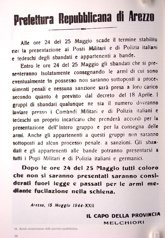 Foto n. 8) Manifesto repubblichino del maggio ’44 che invitava i Partigiani a consegnarsi e a deporre le armi. Il 26 aprile era stato pubblicato un decreto antipartigiano che dava agli “sbandati” trenta giorni di tempo per presentarsi all’arruolamento nell’esercito della R.S.I., pena la fucilazione nella schiena. Il bando scadeva il 25 maggio e, in risposta, alle 21,15 di quel giorno, i Partigiani lanciarono la loro sfida accendendo un minaccioso cerchio di fuoco su tutti i crinali appenninici