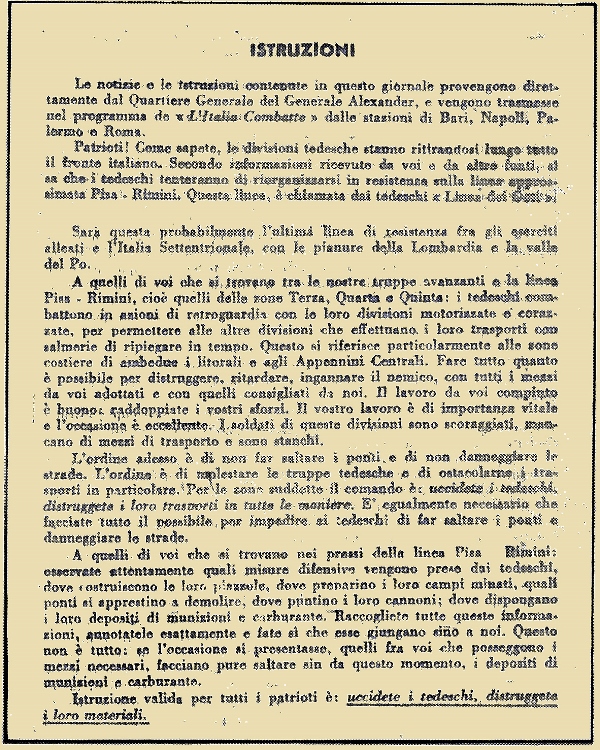 Nella zona oggetto di queste note, la posizione principale sulla quale inizialmente i tedeschi si attestarono per resistere fu lungo una linea est – ovest che attraversava il Lago Trasimeno, nelle vicinanze del quale il XIV Corpo tenne testa con forza agli Alleati sull’Ombrone e il I Corpo Paracadutisti dietro l’Orcia. Il LXXVI Corpo Panzer era a cavaliere del lago e si spingeva verso i monti, mentre ad est l’avanzata Alleata era contrastata dal LI Corpo da Montagna; pertanto raggiunsero la linea del Trasimeno il 20 giugno e la battaglia che ne seguì durò dieci infernali giorni, anche perché altri rinforzi stavano affluendo a Kesselring, come la 34ª Divisione di Fanteria, proveniente dal fronte russo, e la 16ª Divisione SS Panzer Grenadieren, che presero posizione dietro il Corpo d’Armata di von Senger. I britannici attaccarono a cavaliere del Trasimeno e incontrarono un’accanita resistenza da parte dell’Herman Goering, della 1ª Divisione Paracadutisti e della 15ª Divisione Panzer Grenadieren, peraltro avvantaggiati dal ritorno del cattivo tempo. Il peso maggiore dei combattimenti cadde sulle spalle del XIII Corpo Britannico, giacché la zona montuosa ad est del lago impedì l’impiego della 6ª Divisione Corazzata, inviata in loro aiuto. I tedeschi, intanto, continuarono la loro graduale ritirata verso nord, rallentando le forze Alleate quanto bastava per rafforzare la“Grüne Linie”. Questo fu il periodo più tragico per la popolazione locale, i combattimenti avvenivano metro per metro lungo la linea del fronte, che si spostava lentamente a settentrione, come una ruspa che, avanzando, distrugge tutto quello che si trova davanti. Arezzo era una località strategica per gli Alleati, che avevano bisogno di un luogo il più vicino possibile a Firenze e alla Linea Gotica per impiantarvi tutte le basi logistiche e amministrative, venutesi a trovare, oramai, lontane dal nuovo schieramento; ma la posizione della città era ugualmente di grande importanza per i tedeschi e i repubblichini, quale perno di resistenza per ritardare il procedere degli avversari. Durante l’avanzata Alleata i rifornimenti giungevano, di volta in volta, dai depositi di Anzio, di Civitavecchia, Piombino, Livorno e Ancona. Ad Arezzo gli approvvigionamenti alla VIII Armata furono trasportati su strada e ferrovia. La città è circondata da tre lati dalle montagne e si rivelò una posizione particolarmente difficile da raggiungere; il XIII Corpo britannico, facente parte della VIII Armata, occupava un fronte di 35 chilometri e non aveva più riserve, mentre la 4ª Divisione Indiana, che aveva appena completato l’addestramento, era attesa a breve per rafforzare il X Corpo. La linea naturale di avvicinamento ad Arezzo, lungo la pianeggiante Val di Chiana, attraversava l’area del XIII Corpo. A metà giugno, mentre i tedeschi delle 10ª e 14ª Armata ripiegavano verso la Linea Gotica, i britannici del X Corpo si avvicinarono a Perugia. Dal 29 giugno ci fu un gran movimento da parte dei tedeschi; erano in ritirata truppe, carri armati, cannoni, mitragliere, autocarri e quant’altro. Testimoni del loro passaggio narrano che molti soldati mostravano chiaramente, nelle uniformi e nel viso, i segni delle battaglie e della disfatta. La ritirata durò fino al 3 luglio e nella notte fra il 2 e il 3, dove poterono, fecero saltare i ponti alle loro spalle. Il 4 luglio gli Alleati giunsero a Cortona, ma dovettero attendere che anche alle ali le altre Unità avanzassero e solo il 15 luglio, come vedremo, il XIII Corpo dette inizio all’attacco definitivo per giungere a Arezzo, facendosi precedere da un nutrito bombardamento aereo. Furono due le Divisioni che avanzarono, la 6ª Corazzata dal lato della dorsale che separa la Val di Chiana dal senese, e la 2ª Neozelandese sulla destra, alle pendici del gruppo di monti che culminano a Lignano e fanno ala all’anfiteatro morenico nel quale sorge Arezzo. I tedeschi appartenevano a unità del LXXVI Panzer Korps della 1ª Divisione Paracadutisti, delle Divisioni di Fanteria 334ª e 719ª, nonché ad alcuni reparti della 15ª Panzer Grenadieren che, però, combatterono come fanti poiché non avevano a disposizione i mezzi corazzati. Kesselring aveva ordinato di “Tenere Arezzo ad ogni costo” e lo fecero fino alla sera del 15 luglio, allorché iniziarono la graduale ritirata verso l’“Arno Line” e Firenze (raggiunta dagli Alleati il 4 agosto). Fu nelle poche settimane fra la fine di giugno e la seconda metà di luglio che si scatenò la barbarie nazi–fascista; le forze germaniche, infatti, erano affiancate dalle “Brigate Nere”, feroci repubblichini in funzione anti–partigiana e dei quali faceva parte l’aretina “Compagnia della Morte”. Gli appartenenti locali alla Repubblica Sociale Italiana, inoltre, erano rafforzati da repubblichini bergamaschi ed erano chiamati “i morticini” a causa del teschio che esibivano sul berretto. Gli elementi locali e i loro camerati collaboravano attivamente con i germanici e furono anch’essi responsabili degli orrendi massacri che costarono alla popolazione dell’area aretina oltre 1.100 trucidati. Un freddo, enorme, numero che invita a vedere quel che c’è dietro: bambini ignari, miti donne e uomini che avevano conosciuto solo il lavoro e il rispetto per gli altri. Gli Alleati, ovviamente, tendevano in tutti i modi a indebolire le forze germaniche, favorendo il più possibile la costituzione e il rafforzamento delle forze partigiane, ecco perché capita frequentemente di trovare, frammisti ai reperti inglesi e tedeschi, oggetti appartenuti ai Patrioti che, peraltro, pagarono numerosi con la vita l’impari lotta contro forze che, seppur esigue nei confronti dell’imponente Esercito Alleato in arrivo, erano notevolmente superiori e meglio armate dei “Ribelli”. Ricordiamo, come attesta il volantino che riproduciamo, che l’otto giugno del 1944, per favorire l’avanzata degli Alleati, il Generale Al