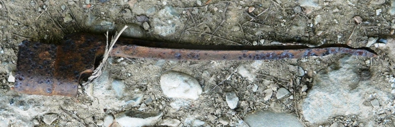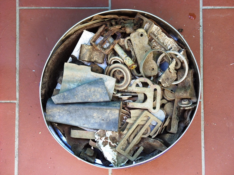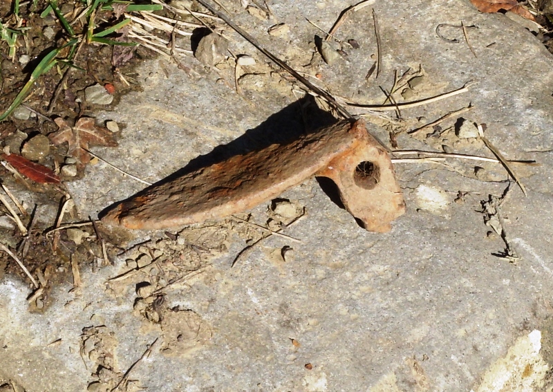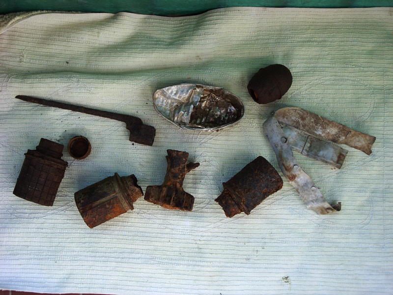 Foto n. 35, 36, 37, 38, 39, 40, 41, 42) Fra i boschi di Catenaia capita di trovare di tutto; vi mostriamo un fodero di baionetta “a chiodo” per il Lee–Enfield n. 4, un paio d’occhiali, purtroppo con il poggianaso staccato e privi di stanghette, nonché un coltello tattico inglese; ma dal terreno sono emersi nastri di mitragliatrice e resti di otturatori MG e SMLE, un termometro, tubetti di medicinali, bottigliette, caricatori per vari tipi di pistole e del Bren, una baionetta del 91/38, monete e coltellini, scatolette, taniche benzina, ecc. I ferri di mulo sono fra i più frequenti ritrovamenti, poiché questi animali erano indispensabili per percorrere l’intrico di sentieri della montagna e furono utilissimi per costruire la cosiddetta “Strada degli Inglesi”