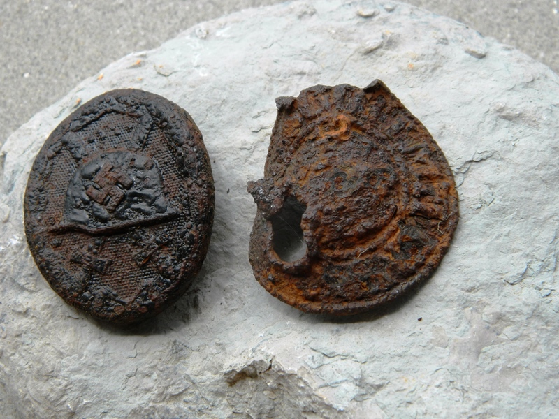 Foto n. 45, 46) Oggetti rimasti al suolo dopo il recupero dei resti di coloro ai quali appartennero, fra loro un soldato dell’esercito tedesco che possedeva questo distintivo della Grande Guerra, e un altro che, almeno a giudicare dalla piastrina intonsa, figura ancora tra i “dispersi”. I tedeschi si ritiravano gradualmente dalle cime più alte di Catenaia, opponendosi con determinazione agli Alleati. Lo “raccontano” i bossoli che si rintracciano dietro i faggi: un gruppetto sparati con lo SMLE, con il Bren o col Thompson, poco più avanti pochi colpi del Mauser o esplosi con la MG (si riconoscono dalla bocca deformata); poi, per trenta – quaranta metri, niente e, di nuovo, mucchietti di cartucce. Una caccia feroce a spietati nemici tra gli alberi e le macchie di ginestra, negli avvallamenti e fra i massi