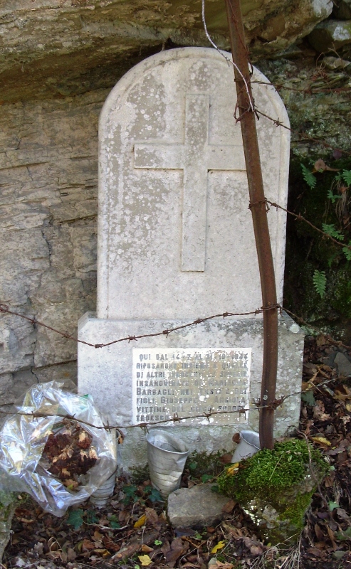 Foto n. 23) Una per tutte, vi mostriamo una sperduta lapide rintracciata a Molin de’ Falchi. Ricorda l’uccisione di una mamma con i suoi due bambini. Chi può essere stato l’alieno che compì una simile atrocità? Molti soldati dell’Esercito tedesco, peraltro, non condividevano le barbare disposizioni di Kesselring e, talvolta, avvertivano la popolazione e consigliavano di allontanarsi perché erano in arrivo “…i cattivi tedeschi”. Lo dissero anche ai genitori di uno di noi, intercettati a Loro Ciuffenna mentre stavano tornando a San Giovanni Valdarno dal luogo dov’erano sfollati, consigliando di tornare indietro. Sul Pratomagno, peraltro, ci fu un rastrellamento in cerca dei Partigiani della Divisione Garibaldina “Arno”, circa duemila sotto il comando di “Potente”, perlustrazione che portò all’uccisione di molte persone e all’incendio di un paese. La casa dei nonni, nei dintorni della quale era nascosta una mitragliatrice e che vedeva ospitati i Patrioti, fu danneggiata con le bombe a mano e i calci dei fucili (noi eravamo nascosti nei boschi)
