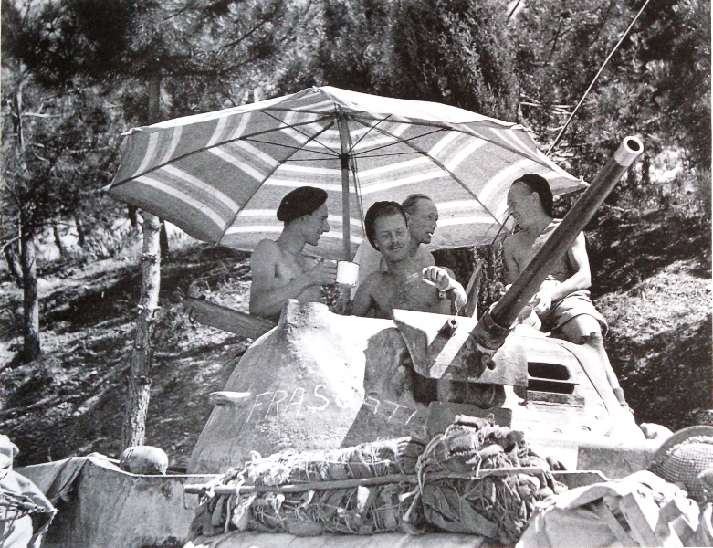 Foto n 27, 28) Nell’assolata mattina del 16 luglio un carro armato britannico entra finalmente nella città semidistrutta. Poi i carristi si concedono un meritato riposo