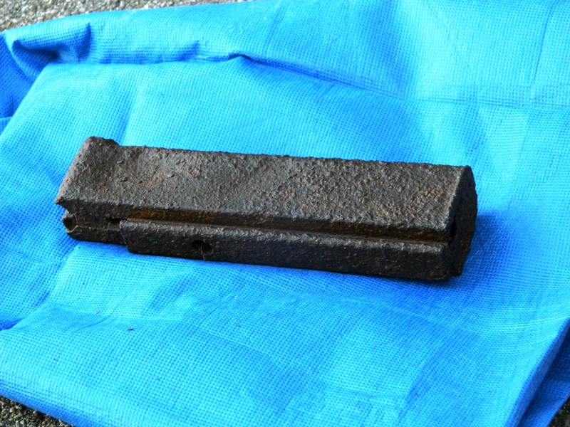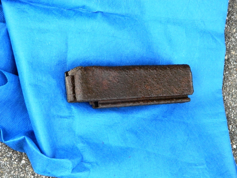 Foto n. 32, 32 bis) Nei pressi del “Sasso della Regina” abbiamo trovato un caricatore vuoto del fucile mitragliatore Thompson, perso durante la concitata fase dell’inseguimento dei tedeschi, in ritirata in direzione dell’Eremo delle Caselle e della Verna. Il cimelio l’osserviamo dai due lati
