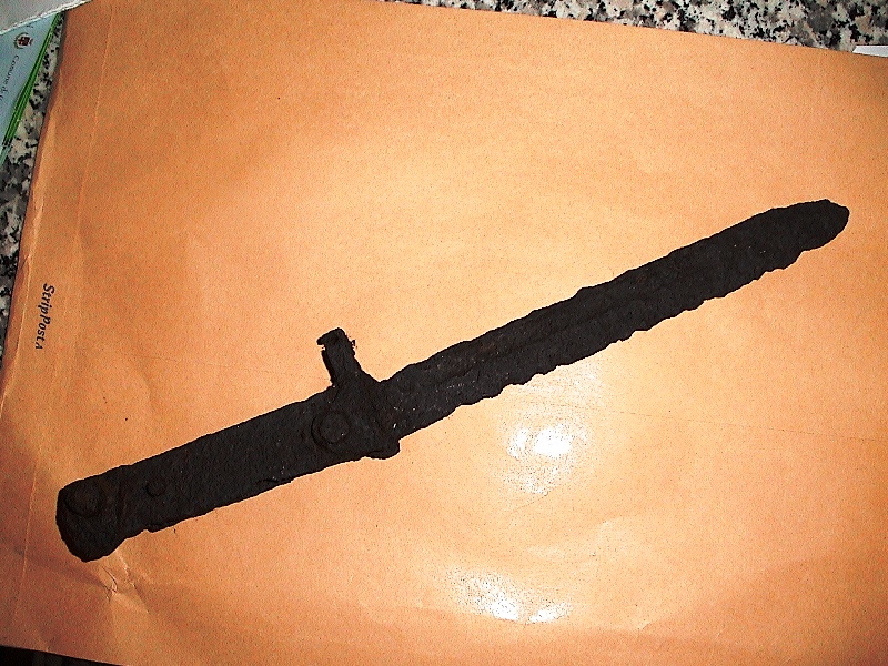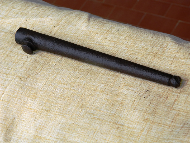 Foto n. 13, 14, 15, 16) Una contorta baionetta del fucile Lee–Enfield n. 4, trovata a “Poggio al Vento”. Gli altri reperti provengono da una fossa scavata in cima al poggio e appartennero ad un tedesco, ucciso da una scheggia di granata entrata dalla schiena e uscita dall’addome (si evince dalla direzione dello squarcio nella fibbia del cinturone). Il poggio era in una posizione strategica, poiché domina sia la strada di fondo valle del Casentino, sia una via secondaria che conduce alle pendici orientali del Pratomagno, pertanto fu assalito il 4 agosto del ’44 dalla Compagnia “A” del 2° Camerons della 11ª Brigata Britannica. Il presidio tedesco era di sessanta uomini, composto da due Compagnie della 50ª Panzer Grenadieren Division e un Plotone d’Assalto del Genio. La battaglia, su un’area ridottissima, durò molte ore e gli scontri avvennero pure all’interno di una casa sotto la vetta, sede del Comando tedesco. Solo la Compagnia del Comando riuscì a fuggire, gli altri furono tutti uccisi. Sotto la sommità erano appostati i soldati britannici, che sparavano le “Mills” con il tromboncino lancia granate. La “collezione” di monete d’argento, emersa a pochi metri dalla cima, nel punto dove, a fine battaglia, furono allineati i cadaveri, fu forse fatta da un tedesco, poiché ce n’è pure una russa da 10 Kopeki