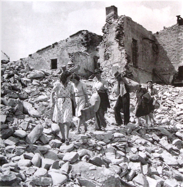 Foto n. 49) Gli abitanti di un paese camminano sui resti delle loro case. Gli sfaceli furono provocati prima dai bombardamenti, poi dai tedeschi in fuga che, per rallentare l’avanzata Alleata, minarono ponti e interi quartieri