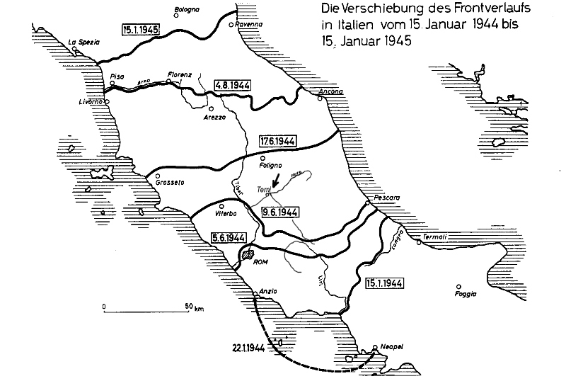 Foto n. 1) Cartina con le linee d’avanzamento delle Forze Alleate dopo Monte Cassino e lo sbarco di Anzio. La “Battaglia per Arezzo” si svolse fra le “Linie” indicate con le date del 17 giugno e 4 agosto 1944